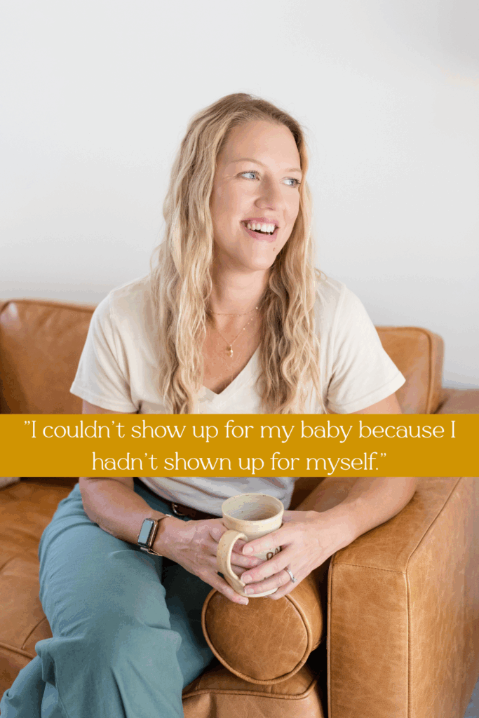 Amy sitting in a a chair holding a mug that says "Radiate Positivity"